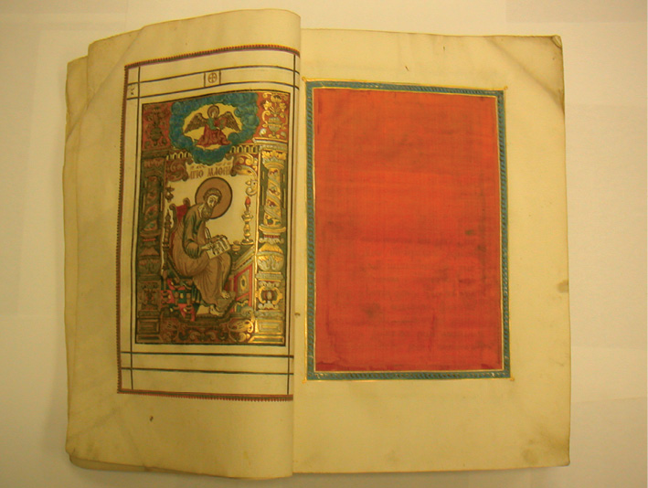 Рис. 2. Подносной экземпляр Евангелия, листы с гравюрами заменены миниатюрами по золоту, выполненными в мастерской Посольского приказа, современны изданию. Евангелие. М.: Печ. двор, IX.1677. (Яр. II, 439). Книга поступила из ярославской усадьбы графа Мусина-Пушкина и ранее принадлежала Софье Алексеевне Романовой.