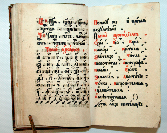 Рис. 7. Азбука. М.: Печ. двор, 09.1685. Разворот начала издания (л. 1об.–2) и последние листы издания (7об.–8). (Яр. II, 586). Единственный известный в России экземпляр Азбуки.